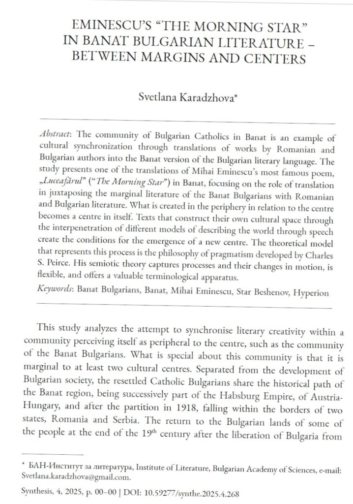 Citation Recommendation: Karadzhova, Svetlana. “Eminescu’s The Morning Star in Banat Bulgarian Literature – Between Margins and Centers”. Synthesis, 4 / 2025: 268-281.